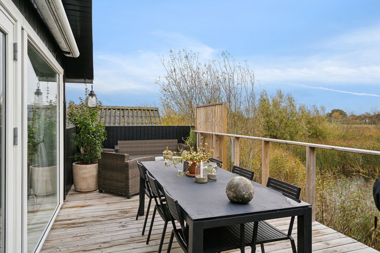 udsigt til søen og direkte udgang til den skønne store solterrasse med bl.a. elektrisk markise og