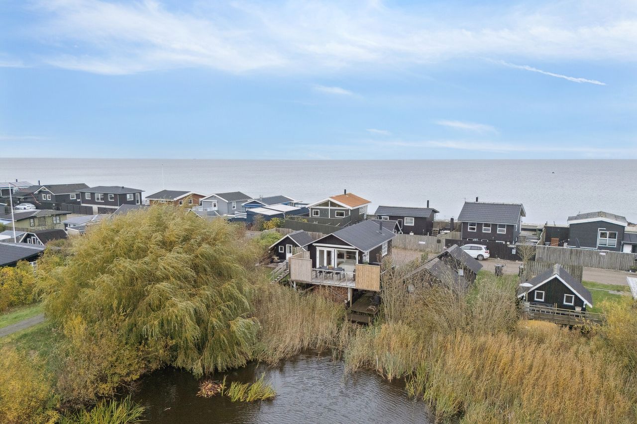 Huset er beliggende helt unikt med en dejlig helt lukket og ugenert have med udendørs bad hyggeligt anneks med egen træterrasse, indkørsel med plads til min 2 biler, stor dejlig solterrasse, hvorfra der er en herlig udsigt til søen og en herlig udsigt til havet og stranden, der er kun ca. 50 m væk.