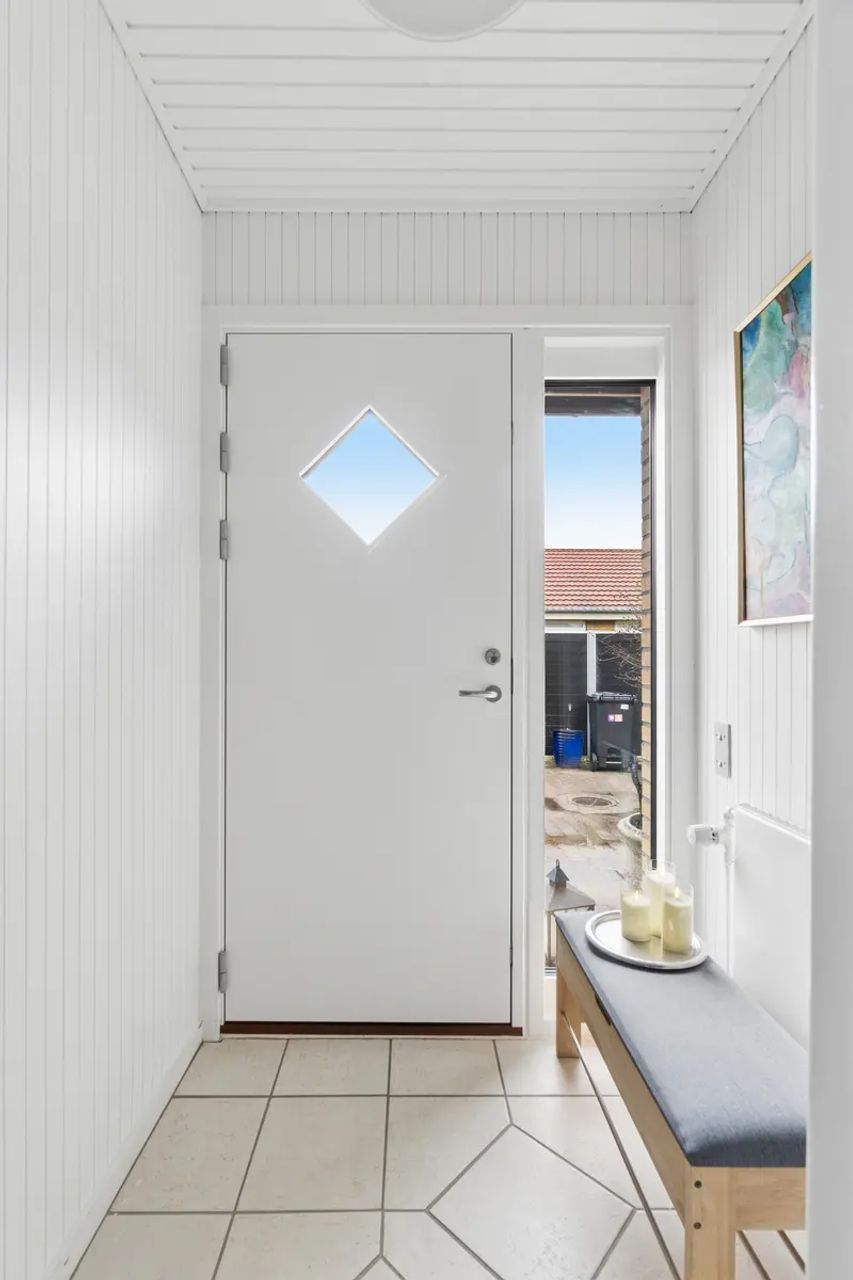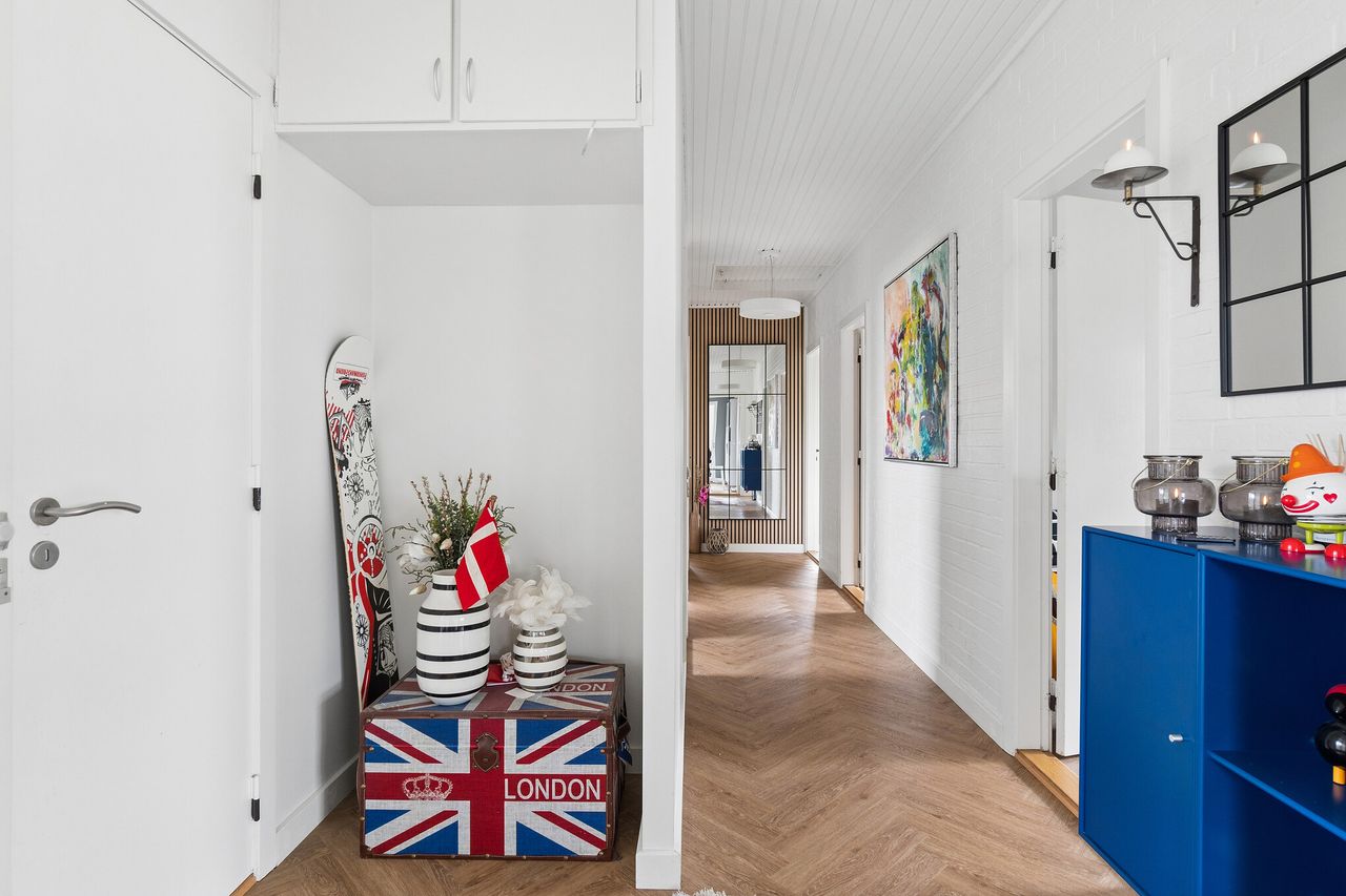 Vindfang, rummelig entre/fordelingsgang med flot sildebensgulv, pænt gæstetoilet, pænt rummeligt køkken med hvide elementer og alt i hårde hvidevarer, stor hyggelig vinkel spise-/opholdsstue med flot sildebensgulv og udgang til en nyere stor lys udestue med det samme flotte sildebensgulv, termovinduer og selvstændig varmepumpe. Fra fordelingsgangen er der adgang til dejligt soveværelse med skabe, pænt badeværelse med kar, glasniche, mosaikgulv og bordarrangement, kontor/værelse og 2 gode børneværelser samt stort bryggers/baggang med klinkegulv og videre adgang til godt disponibelt rum.